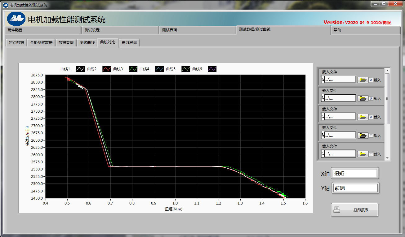 •自動測試方式:即負載根據設置自動加載,掃描出電機從空載到堵轉(或設定值)的特征曲線。因為電機在零載到相應負載和相應負載到空載這個過程中,下降曲線和回升曲線是存在相應誤差,系統可以通過下降曲線和回升曲線計算擬合出電機最真實的曲線,所以此界面就是最好的測試方式。