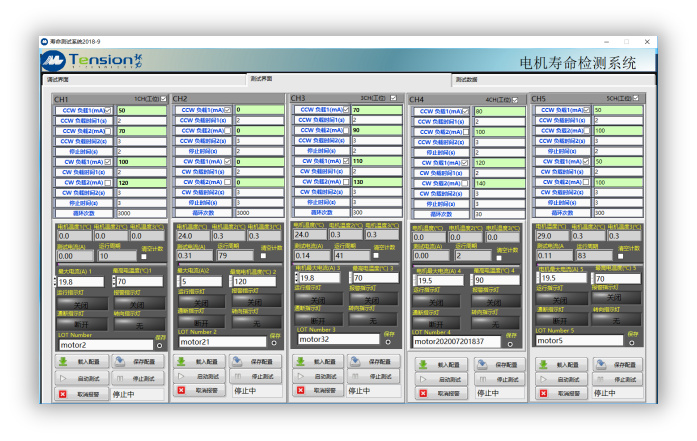•可以通過改變制動器電流來設定不同的電機加載,同時可以通過上位機軟件任意設定電機的工作與停止時間,最高工作循環(huán)為99.99萬次,循環(huán)次數(shù)達到后自動停機,其中任何一工位出現(xiàn)問題只會自動停止該工位的運行
